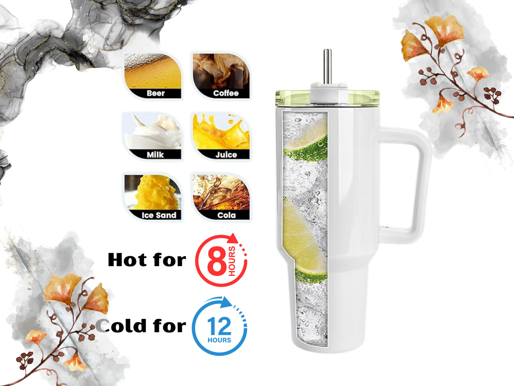 Our tumblers are made of stainless steel material, durable and double-walled, not easy to break, which can keep drink hot for over 8 hours / cold for 12 Hours.
